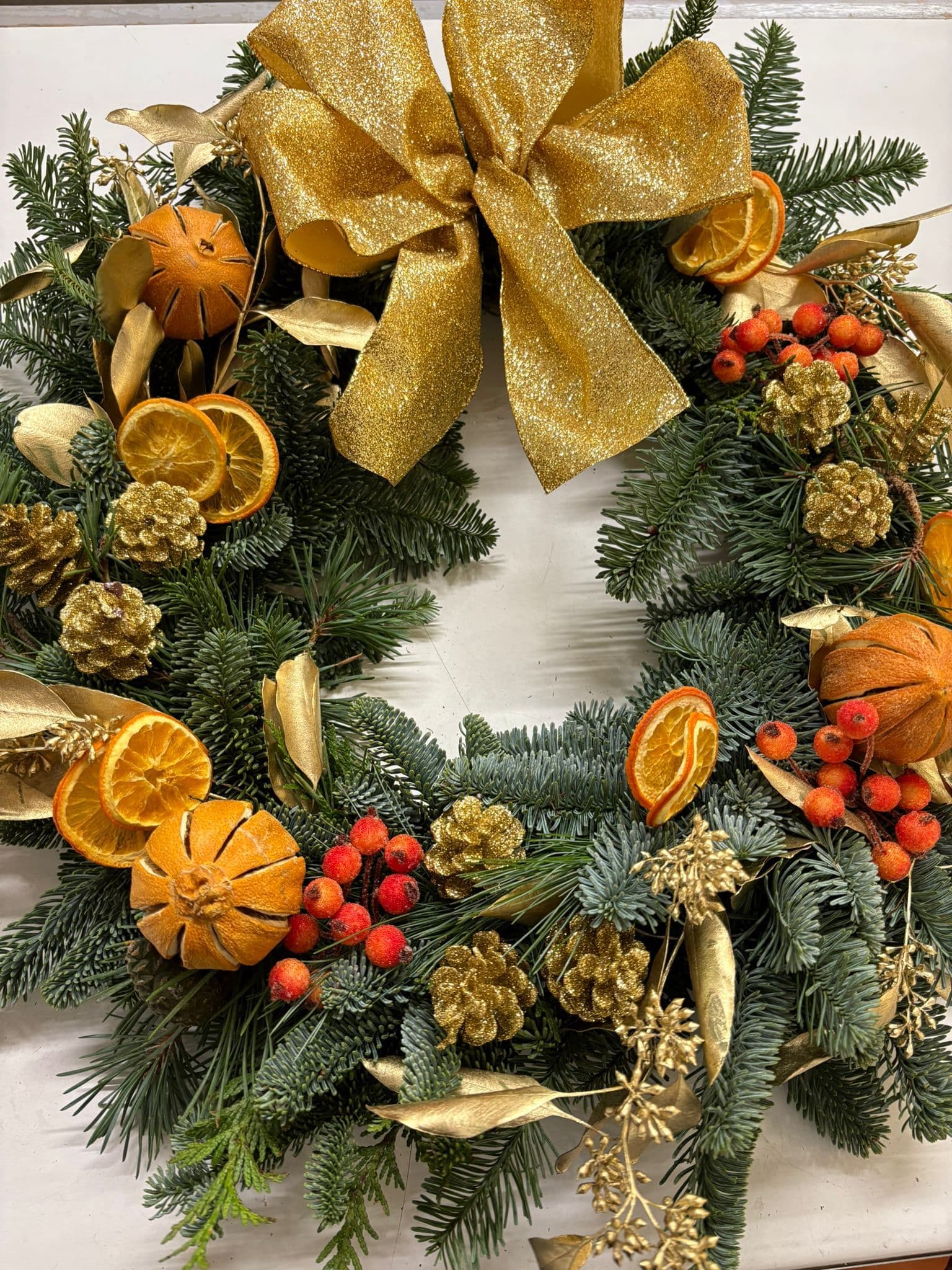 Sparkly gold Door Wreath with all the traditional scented Oranges Cinnamon and Spruces, adding glamour to your Door!