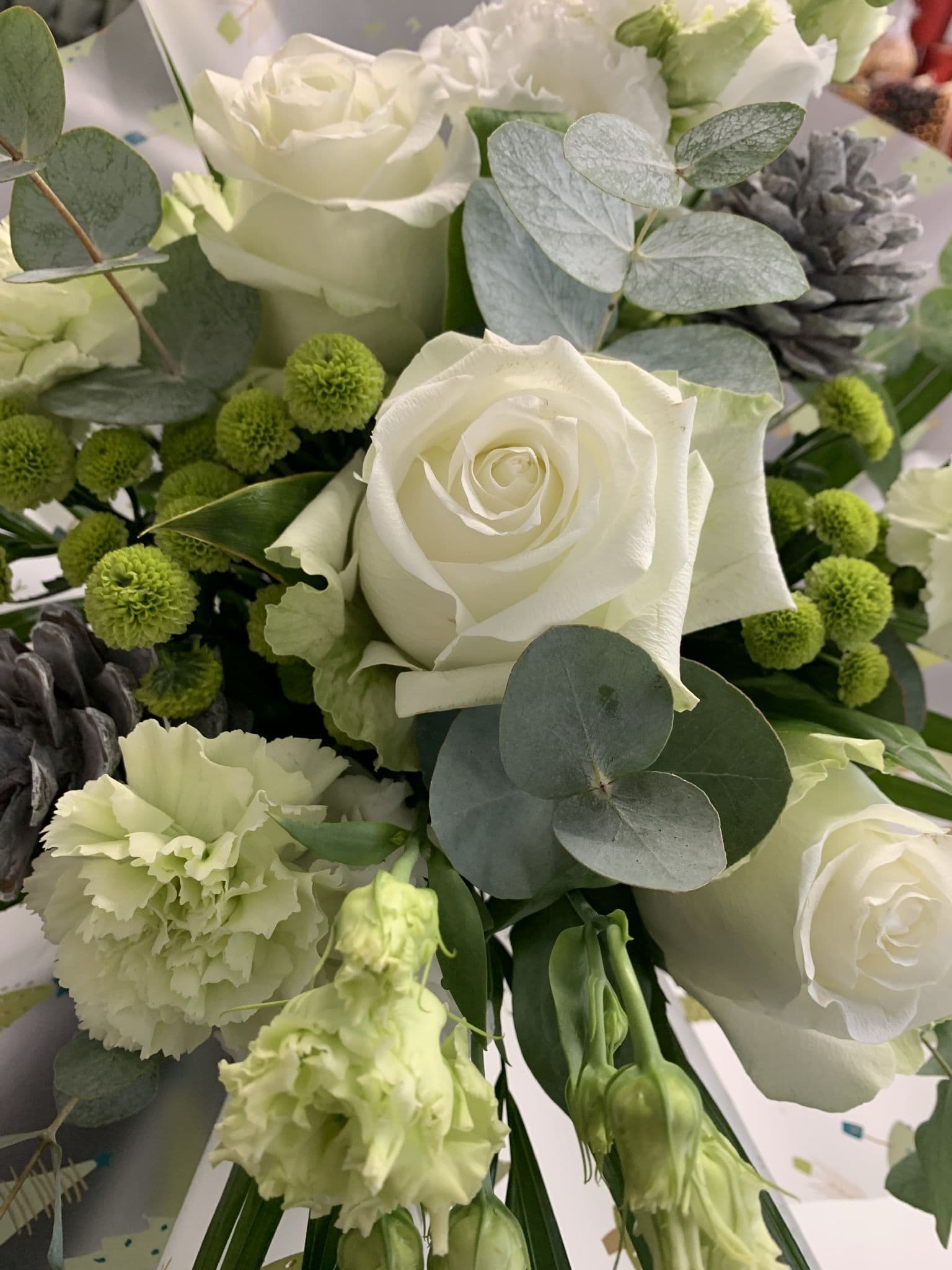 A frosty white Handtied Bouquet in a giftbox, including Roses, Germini, Carnations and Blooms