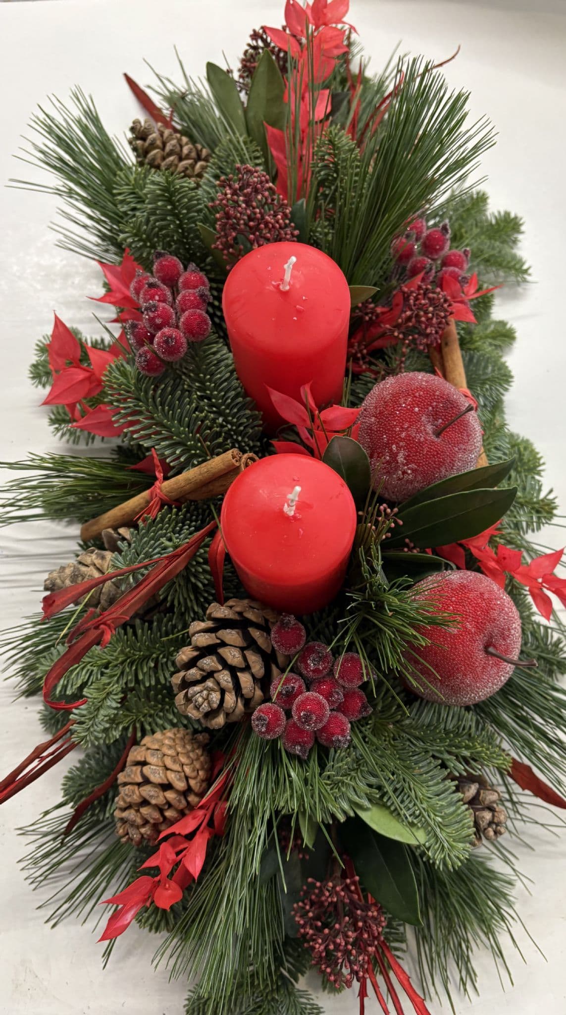 Bright Red double Candle design, cones and berries for a festive feel on your Christmas table!