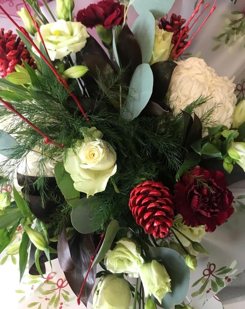 A bold red and lime handtied bouquet, with red Roses, Germini and skimmia and lime Chrysanthemum Blooms, festively decorated with cinnamon, baubles and red twigs.