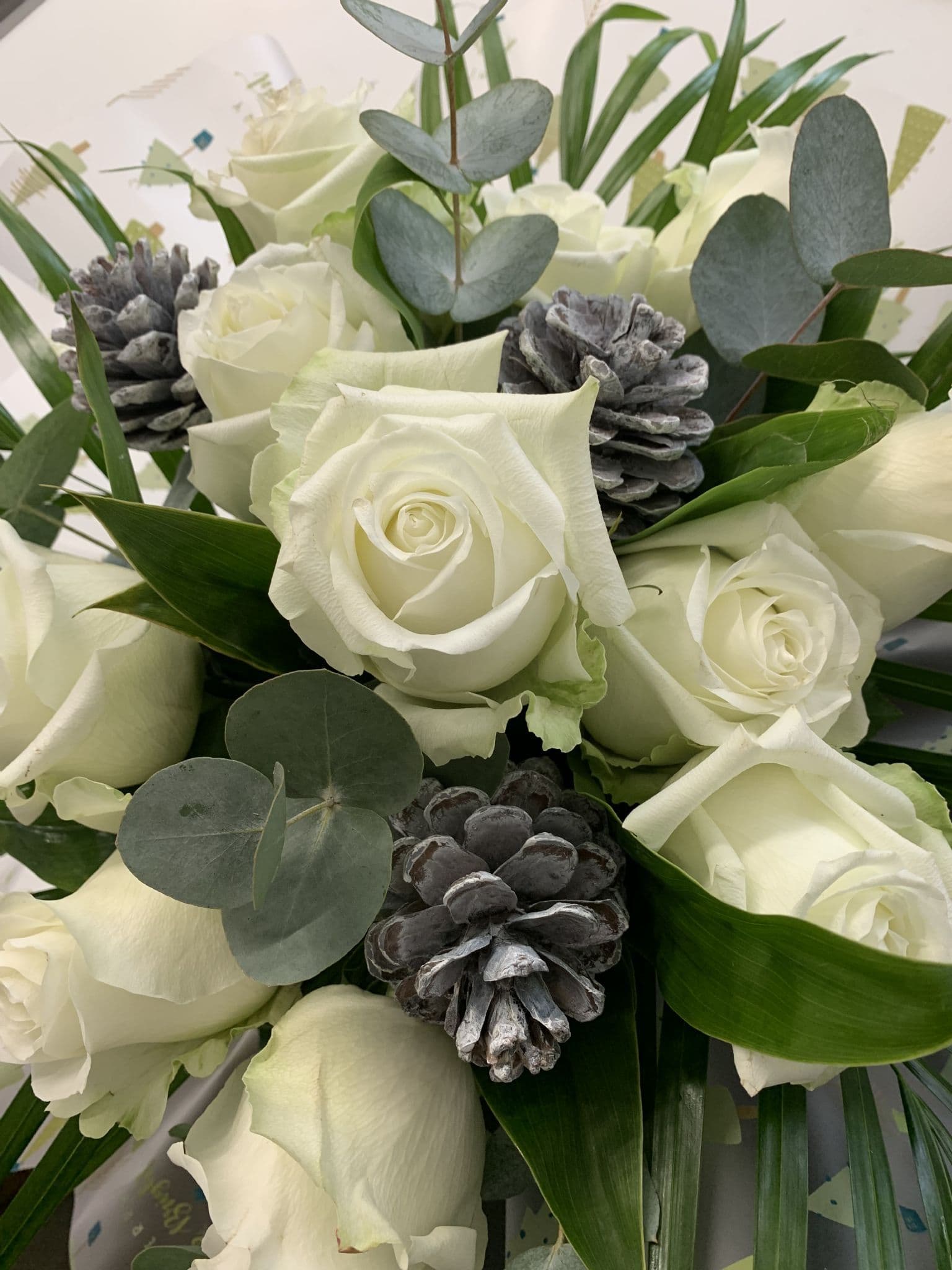 A Dozen (or more! please upgrade) White Roses with lush foliages and a frosty wrap!